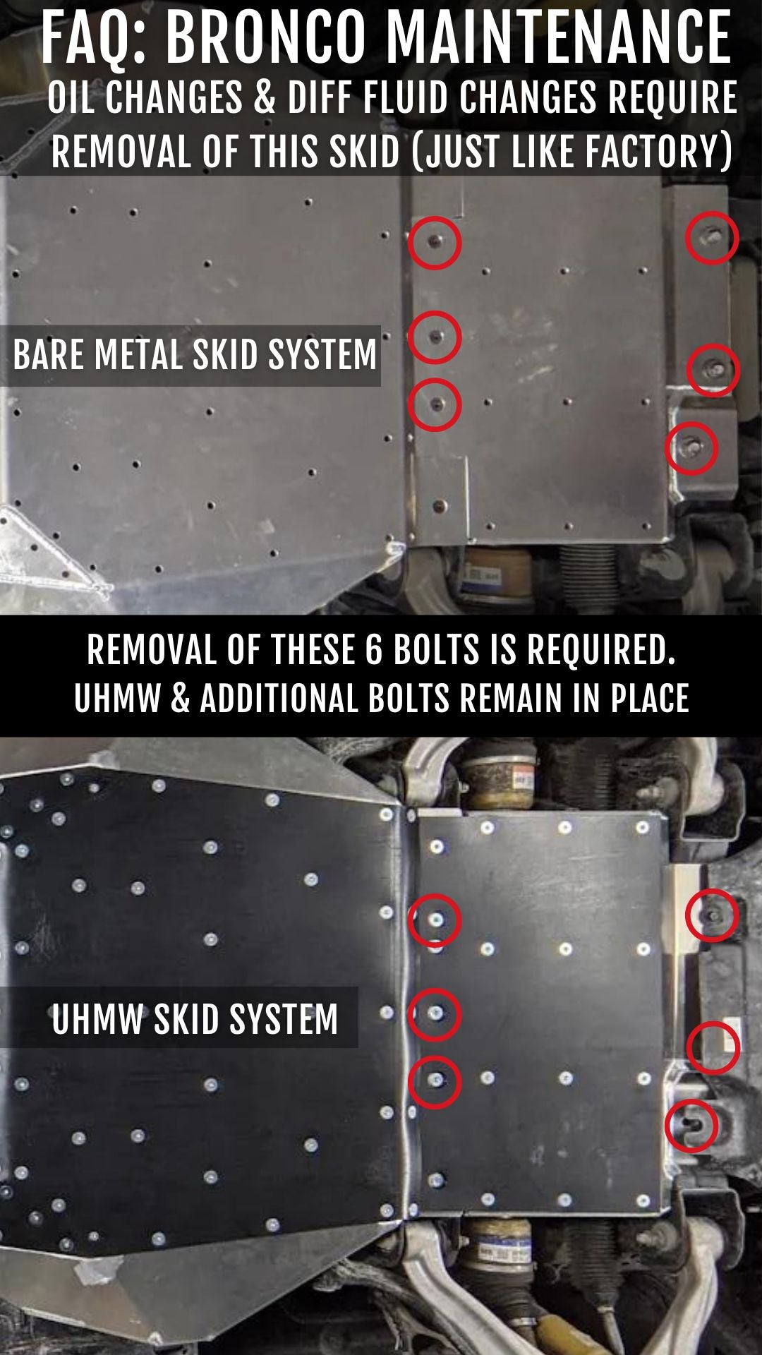 Just like the factory skids, removal of the differential and engine skid is required to perform oil changes and differential fluid changes. We've had access panels suggested to us on this component, but by the time you account for the path of oil draining on the Bronco engine options, the access panel size becomes the majority of the skid. For this reason, we kept it simple, and suggest removal of the skid with the 6 bolts highlighted on the right.
