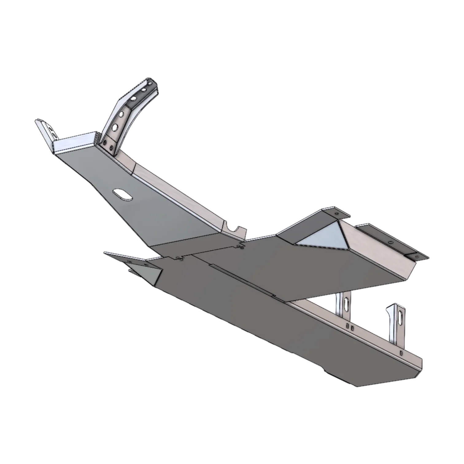 Given all of the added protection these offer over factory pieces, full belly skids become the largest piece of real estate to consider on or under your Jeep when you're looking to save weight. We chose to build these out of 5052 Aluminum for it's superior formability and strength compared to many other alloys -- as the design and shape of the skids largely determines how rigid they will stay over time. We designed these belly skids to locate bolt heads up and out of the way where possible as can be seen on the rear crossmember and fuel tank skids. The skids shown here are a pre-production unit; production units are countersunk on all the bolt holes on the bottom faces of the skids.