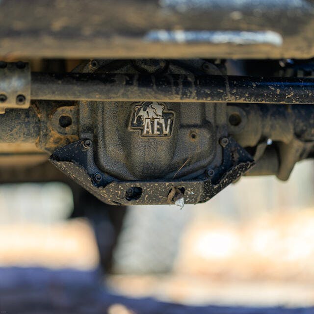 We build the JL Front Diff Skid (FDS) from a combination of 1/4" and 3/8" thick steel. This diff skid ties into multiple locations on the differential flange, as well as clamping tight to the snout of the differential. As a result, you will distribute any force -- such as the weight of the vehicle on a rock -- over a much larger area. This skid also extends your coverage to the pinion and yoke/flange where the front driveshaft attaches.