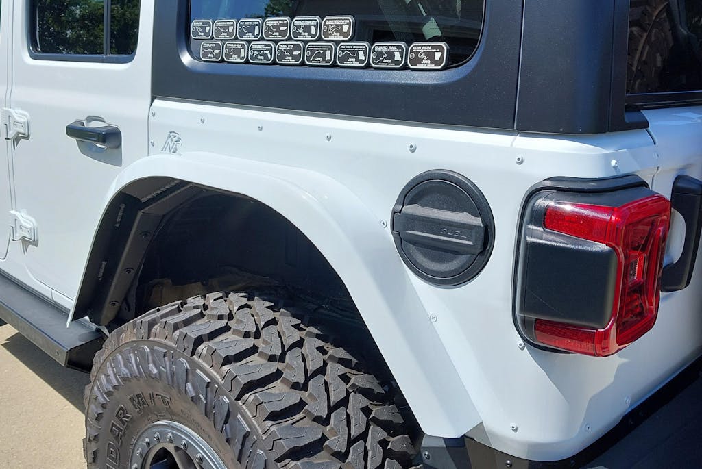 Please note that the fuel filler door will touch the fender flare when opened (only on JL Rubicon/Sahara models with factory fuel door instead of open-style/exposed fuel cap)