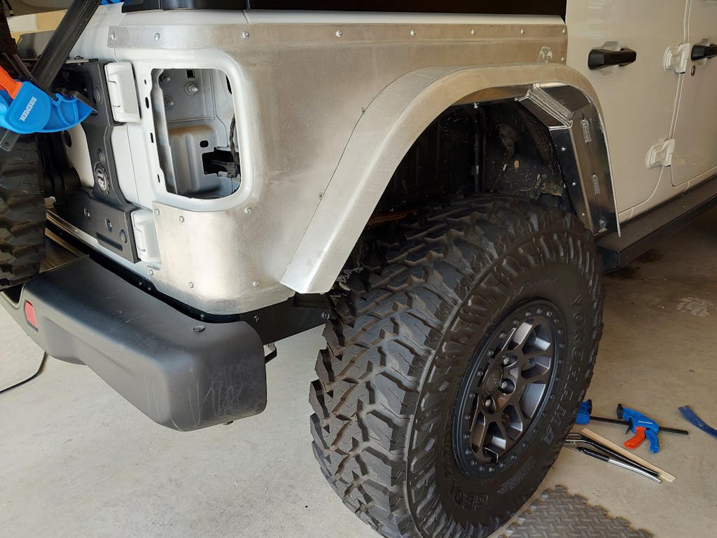 Introducing our aluminum high line fender flare option for the rear of the JL Wrangler! These flares increase tire clearance over split/modified Rubicon factory flares and actually sit a touch higher as well. These are designed for a slight rear wheelbase stretch (not required) and room to accommodate up to 42" tires with minimal bumpstops since we love our suspension up-travel. If you're going to invest in premium suspension, don't give up an inch of it with bumpstops for a low hanging flare!