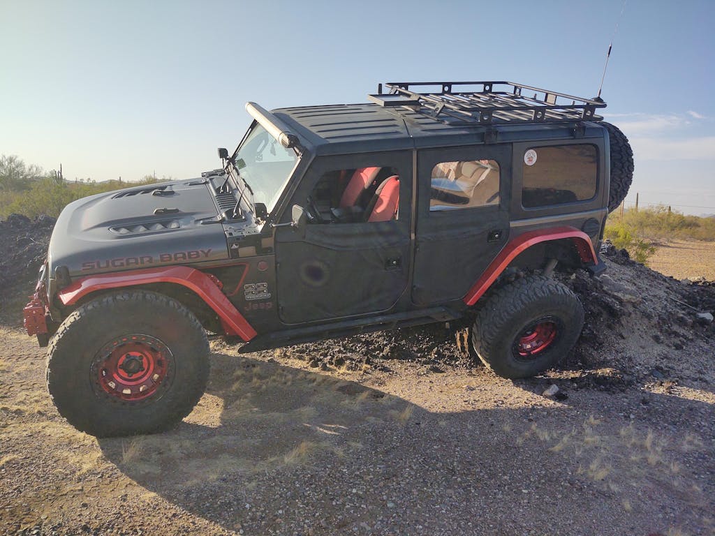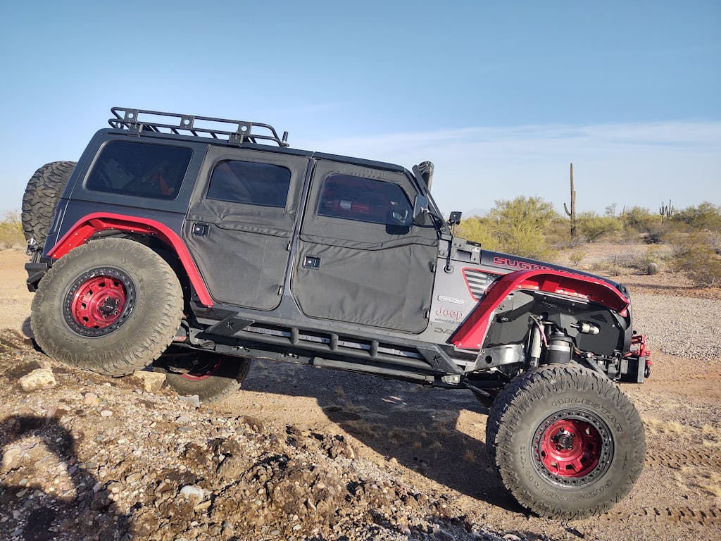 Many of these photos show pre-production units with 37" tires/factory axles and factory bumpstops (Granite/Gray JL) and others are shown with 42x14.50R17 tires (the white JL) on full width 68" wide axles. Production Units shown with 40" tires and 72.5" width axles and additional lift on the "Stepchild"/Red JL.