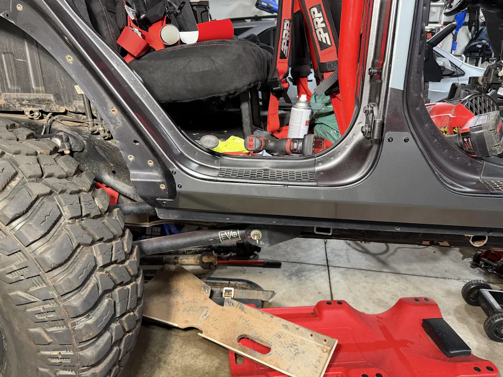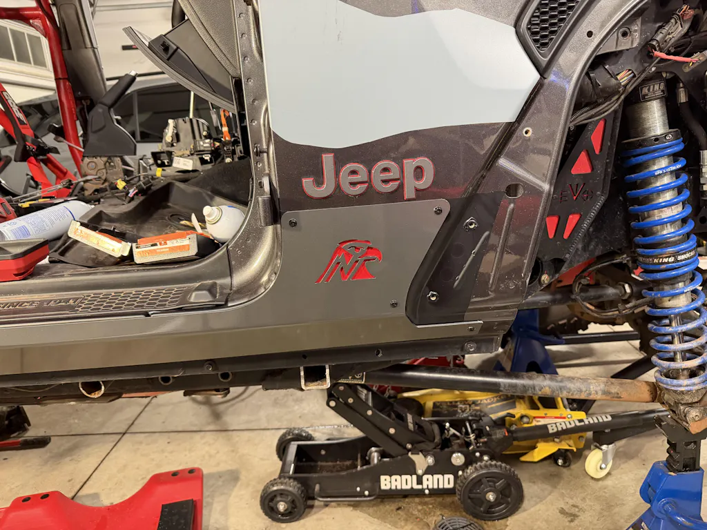 Above: View of Next Venture Trail Breaker and Rimrocker Series Rockslider and Rocker Armor (Trail Breaker and Rimrocker rock sliders are sold separately). Drilling and installation of hardware behind the rock slider is difficult due to the full coverage nature of the slider design and is nearly impossible. Either the "stick on" or "9 bolt" mounted rocker guards are ideal for installation with our Trail Breaker and Rimrocker Sliders for this reason.